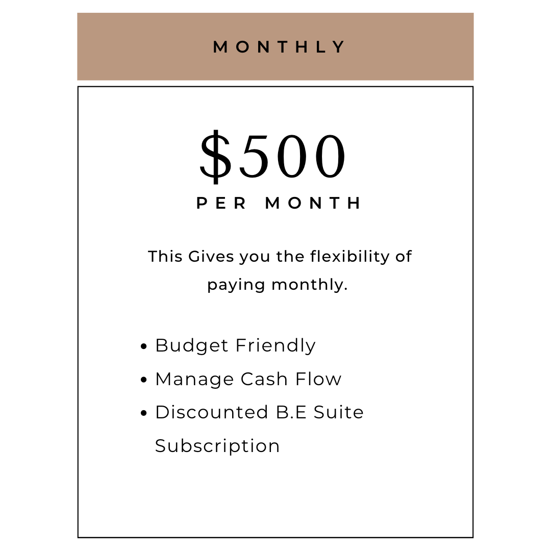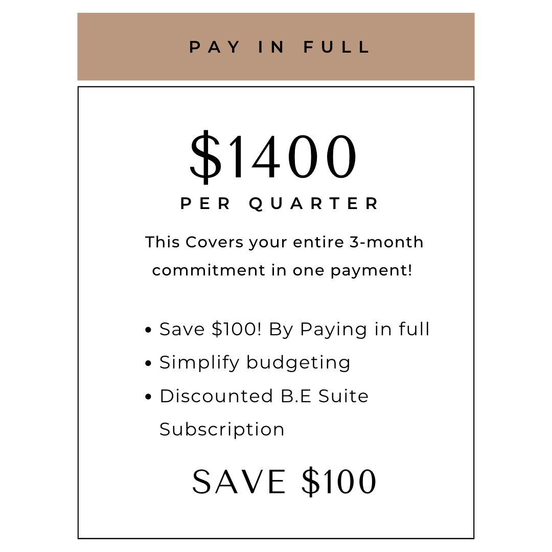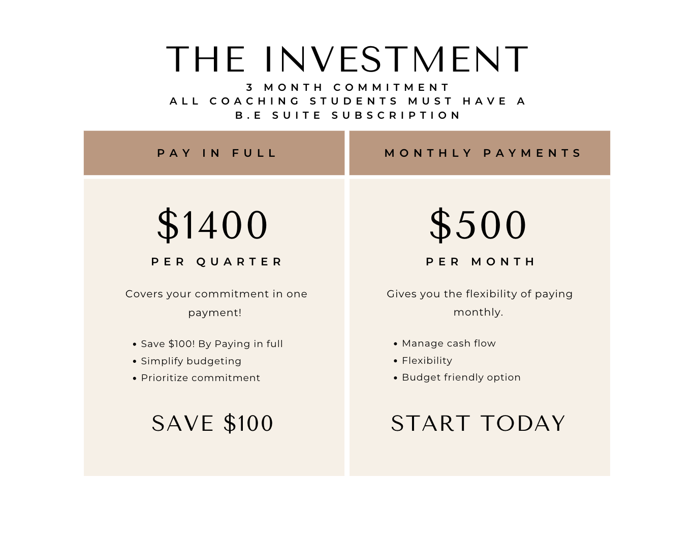 Please note that all clients are required to have a B.E Suite subscription during the coaching program. However, we offer a discounted rate of just $97/month for our coaching clients.